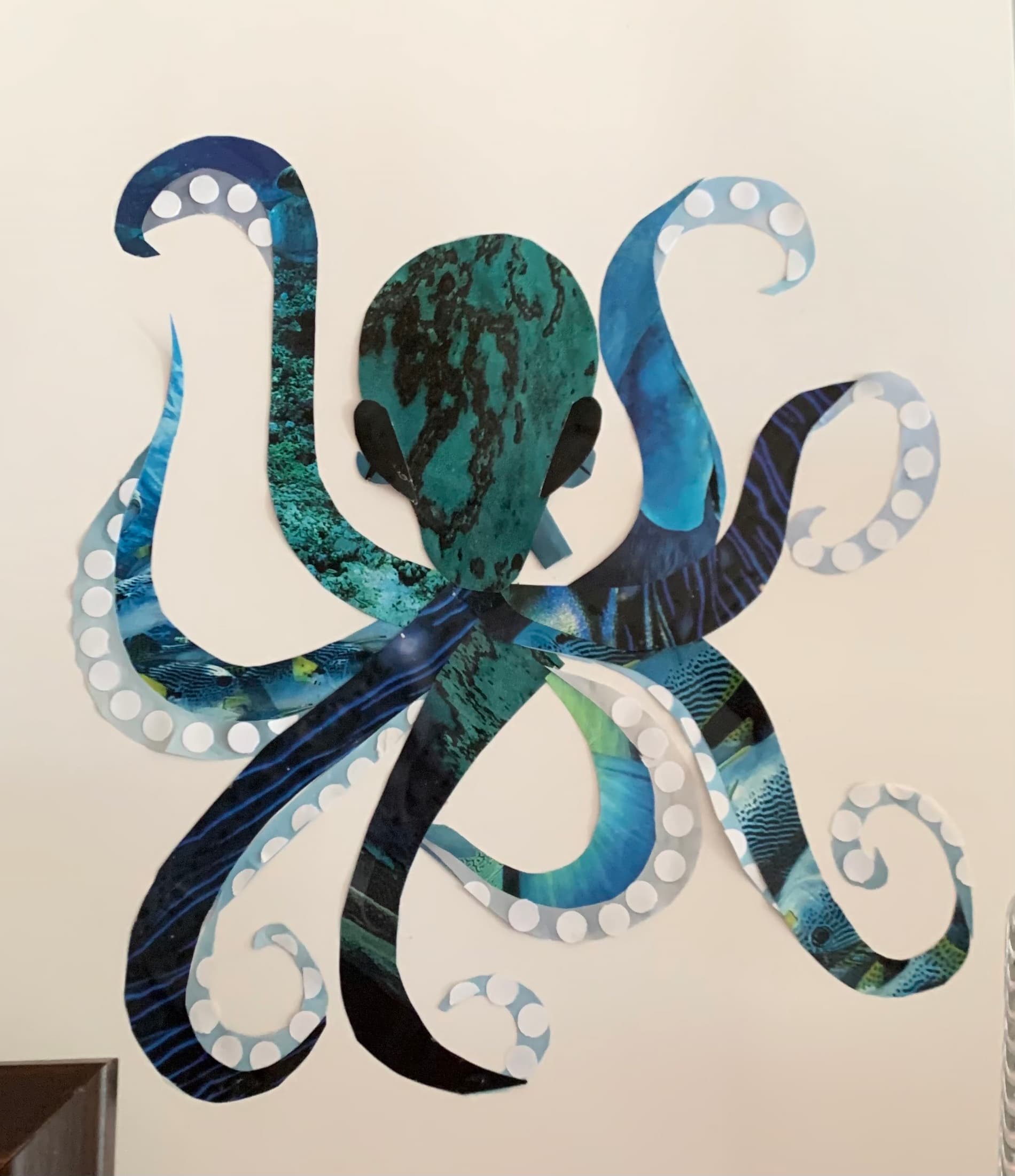 Jean Poole, Blue Octopus, Paper Collage, 13×15, $100