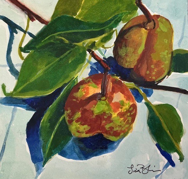 Lisa Bliss Still Life with Two Pears, Watercolor, 7×7, $95