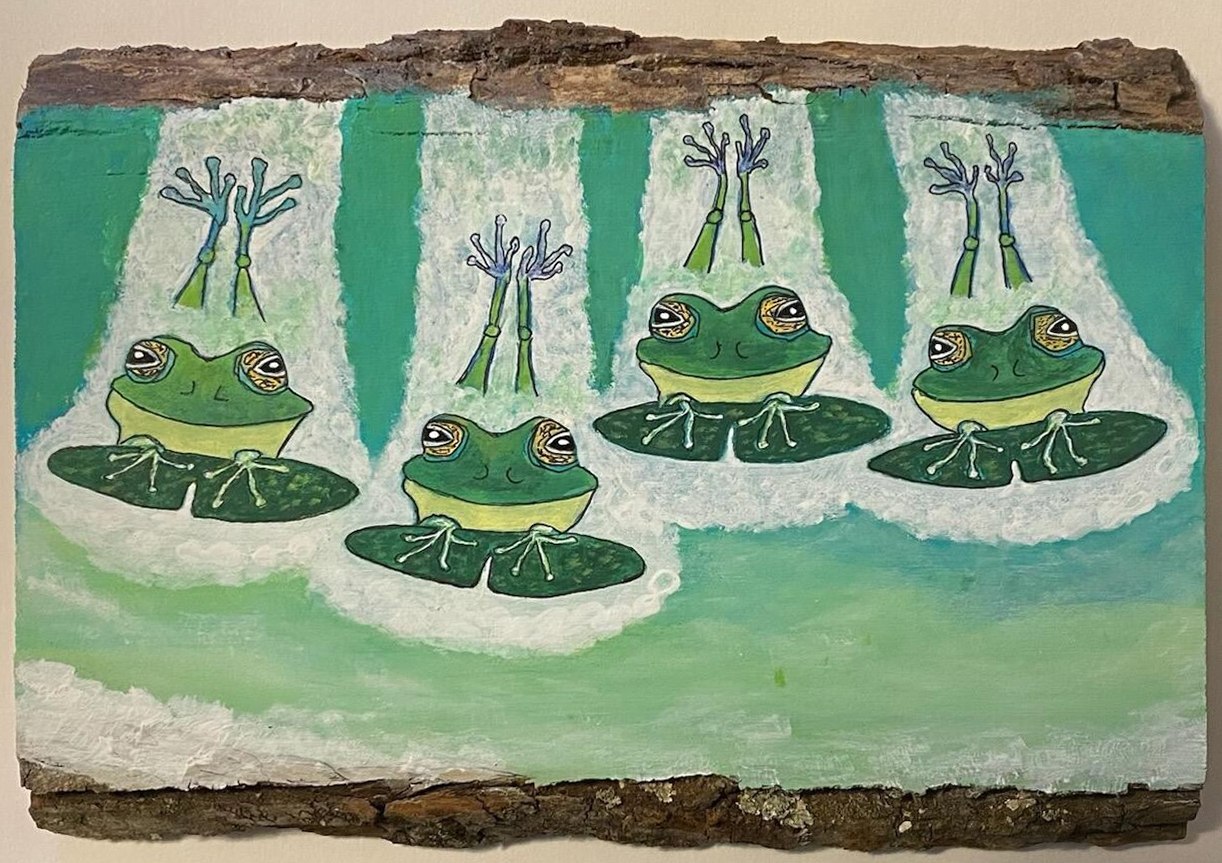 Peggy Matheson, Surfing Frogs, Acrylic, 8x11x1,$80